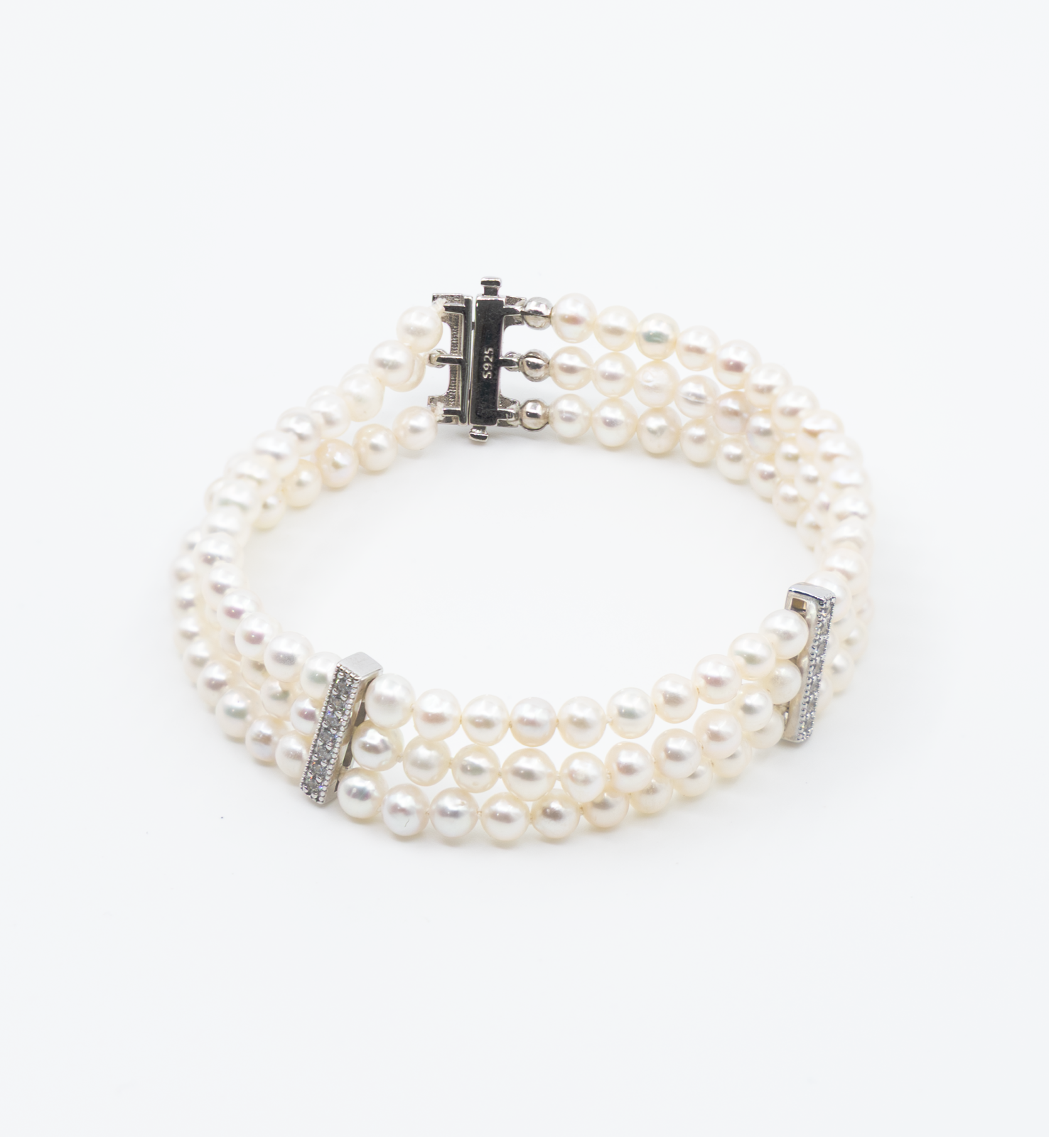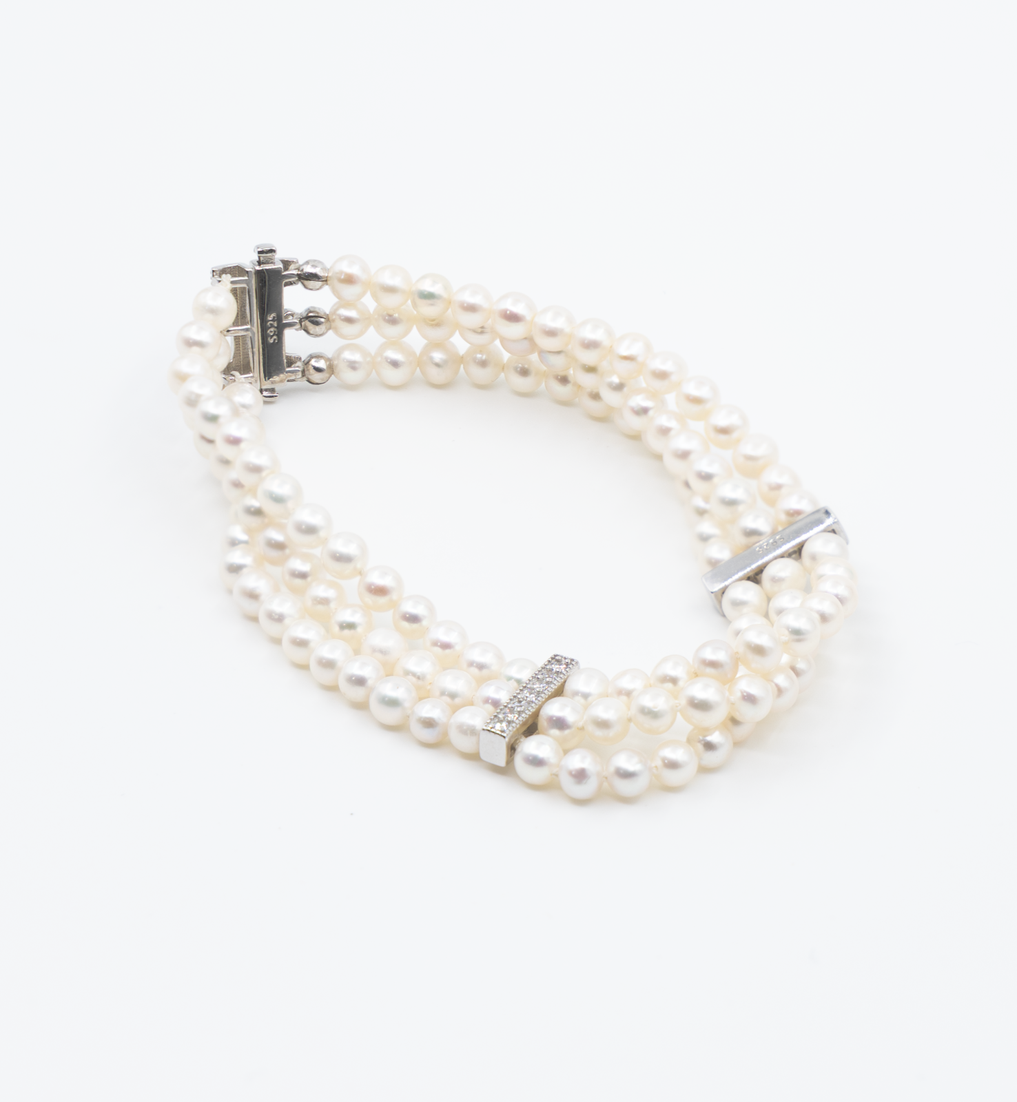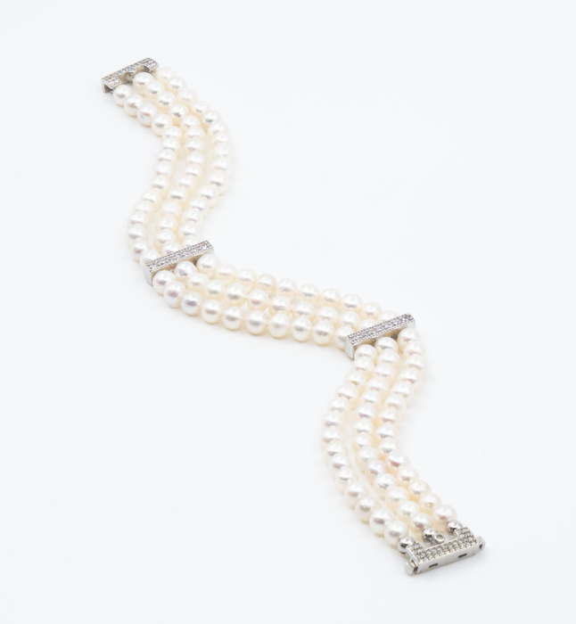 Bratara din argint cu zirconiu si trei randuri de perle naturale.