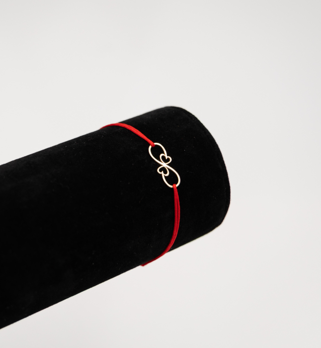 Bratara reglabila cu snur rosu si cu pandantiv din argint placat cu aur in forma de infinit cu inimioare
