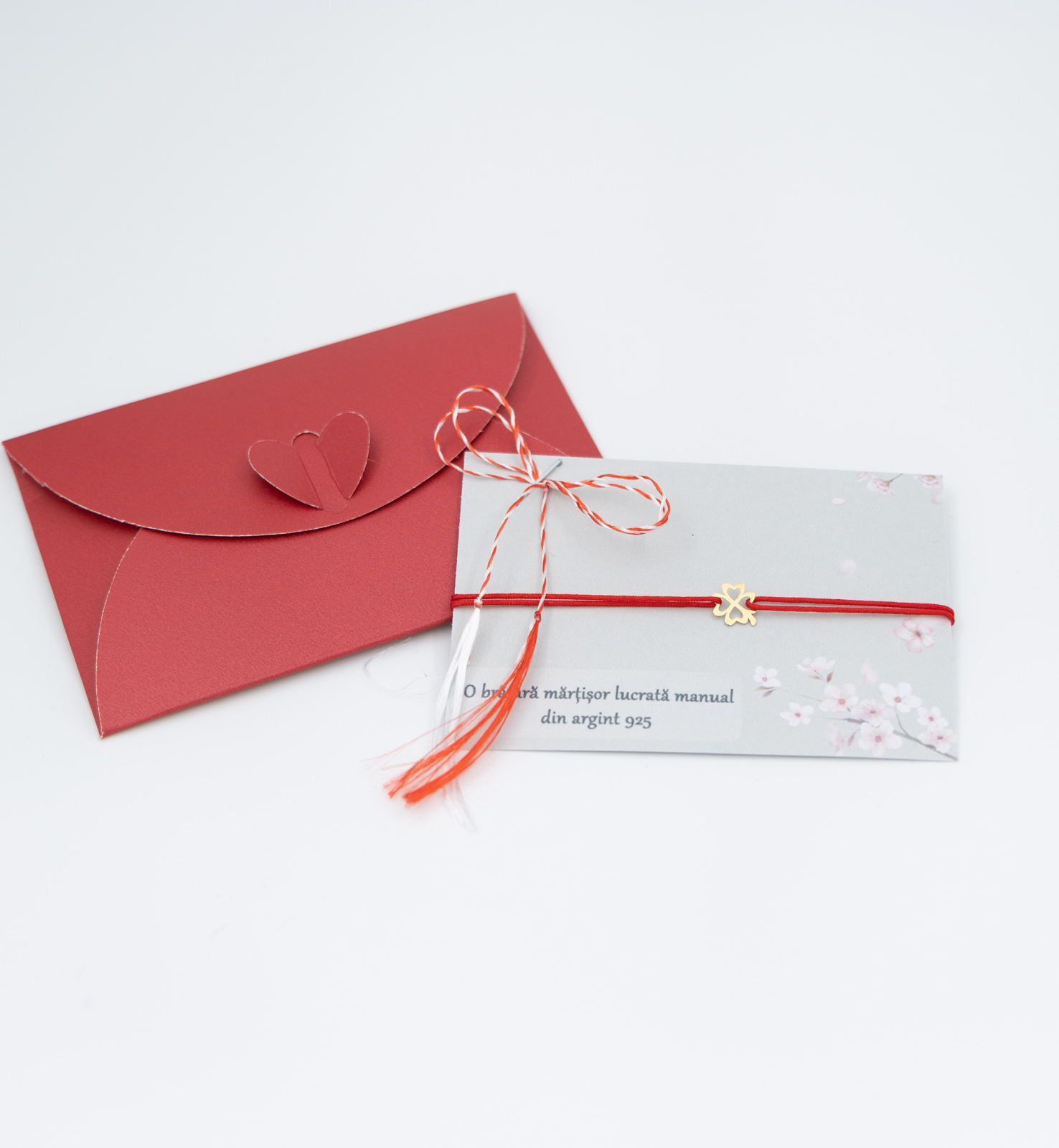 Bratara reglabila cu snur rosu si cu pandantiv din argint placat cu aur de 18K  forma de trifoi