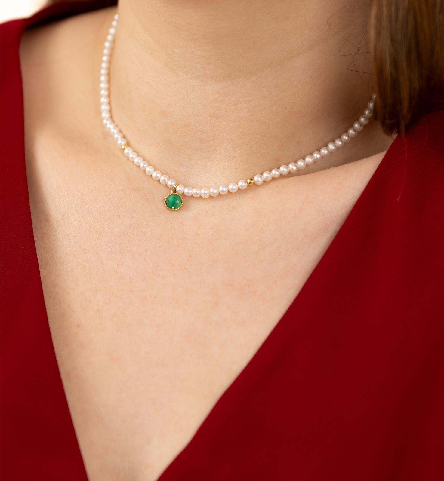 Colier cu perle naturale si pandantiv cu agat verde din argint placat cu aur