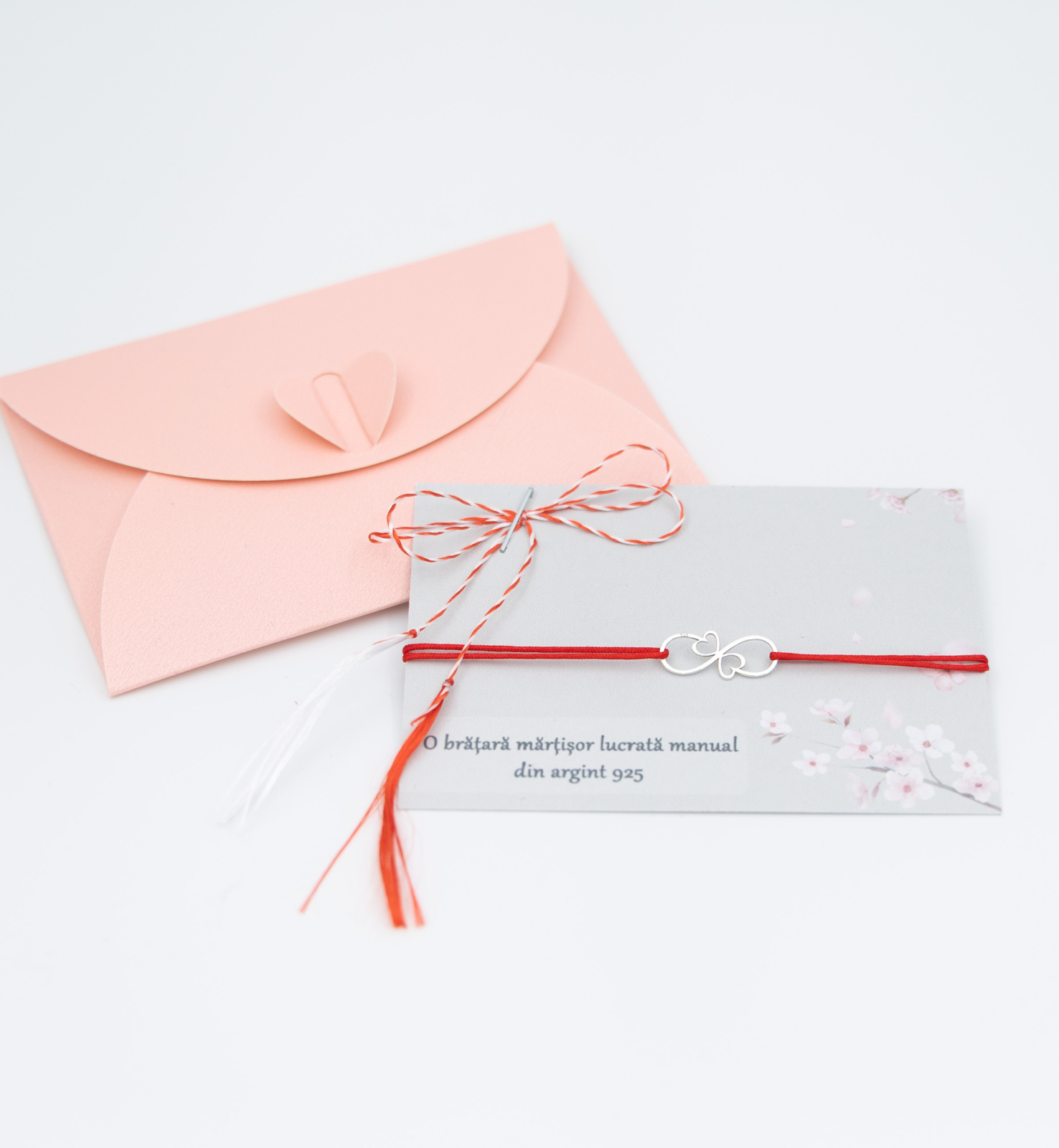 Bratara reglabila cu snur rosu si cu pandantiv din argint in forma de infinit cu inimioare